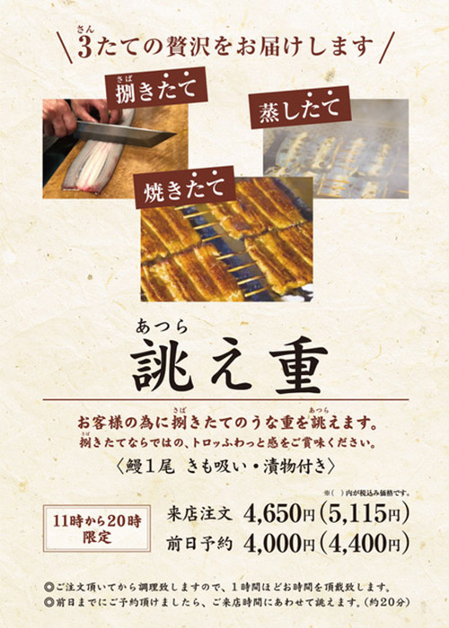 | 松重 | 2,600円(2,860円) | 本蒲焼 | 3,050円(3,355円) |